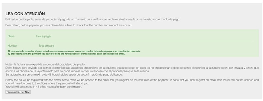 Please confirm your tax code is correct and the amount you will pay. At the end of the page you will see a “Pague ahora / Pay now” grey button, click on it.